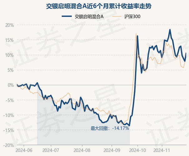 证券之星消息,11月27日,交银启明混合A最新单位净值为1.1403元,累计净值为1.3063元,较前一交易日上涨2.43%。历史数据显示该基金近1个月下跌1.9%,近3个月上涨26.0%,近6个月上涨10.48%,近1年上涨0.62%。该基金近6个月的累计收益率走势如下图: