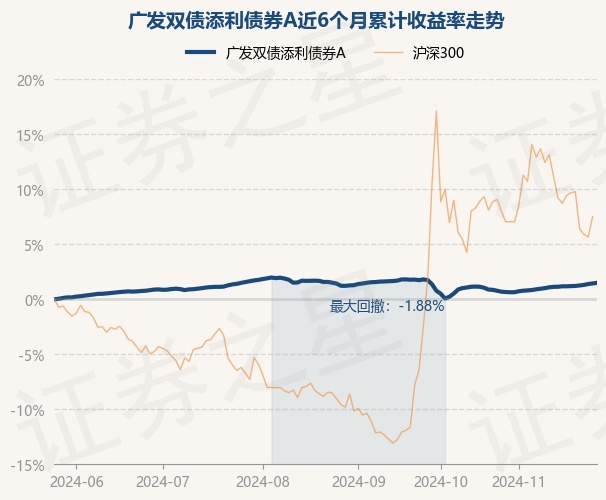 证券之星消息,11月27日,广发双债添利债券A最新单位净值为1.2213元,累计净值为1.6442元,较前一交易日上涨0.06%。历史数据显示该基金近1个月上涨0.72%,近3个月上涨0.26%,近6个月上涨1.49%,近1年上涨5.45%。该基金近6个月的累计收益率走势如下图: