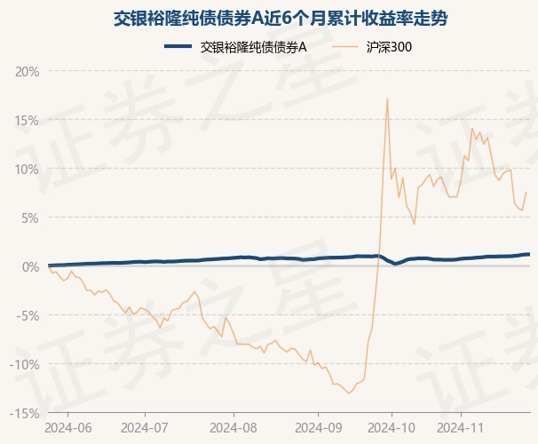 证券之星消息,11月27日,交银裕隆纯债债券A最新单位净值为1.3827元,累计净值为1.4117元,较前一交易日上涨0.01%。历史数据显示该基金近1个月上涨0.55%,近3个月上涨0.57%,近6个月上涨1.17%,近1年上涨3.83%。该基金近6个月的累计收益率走势如下图: