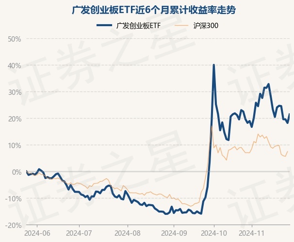 证券之星消息,11月27日,广发创业板ETF最新单位净值为1.324元,累计净值为1.324元,较前一交易日上涨2.72%。历史数据显示该基金近1个月下跌1.31%,近3个月上涨44.46%,近6个月上涨21.45%,近1年上涨15.98%。该基金近6个月的累计收益率走势如下图: