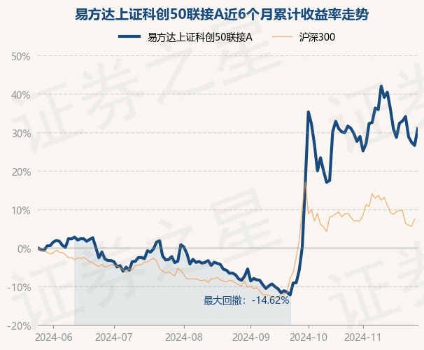 证券之星消息,11月27日,易方达上证科创50联接A最新单位净值为0.77元,累计净值为0.77元,较前一交易日上涨3.43%。历史数据显示该基金近1个月下跌0.54%,近3个月上涨42.36%,近6个月上涨30.97%,近1年上涨12.44%。该基金近6个月的累计收益率走势如下图: