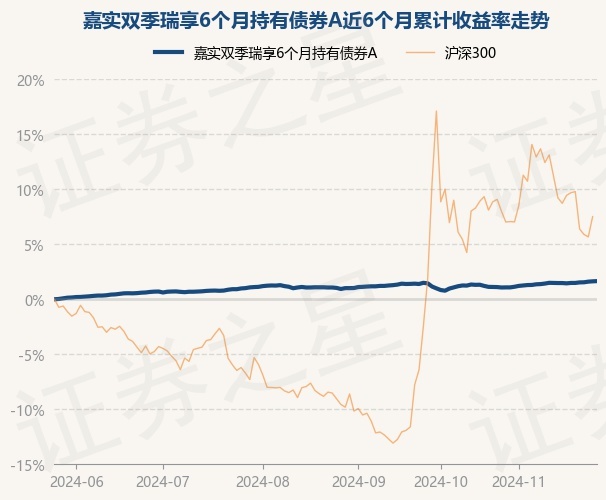 嘉实双季瑞享6个月持有债券A为债券型-混合一级基金,根据最新一期基金季报显示,该基金资产配置:无股票类资产,债券占净值比96.96%,现金占净值比1.07%。