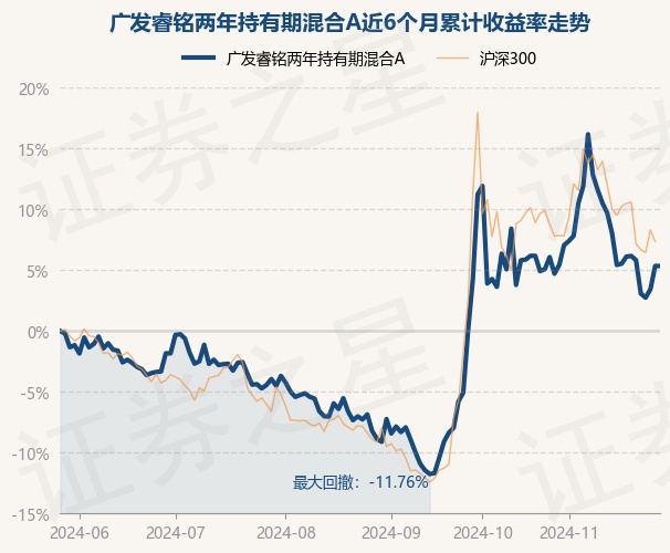 证券之星消息,11月28日,广发睿铭两年持有期混合A最新单位净值为0.9946元,累计净值为0.9946元,较前一交易日上涨0.0%。历史数据显示该基金近1个月下跌0.79%,近3个月上涨15.48%,近6个月上涨5.24%,近1年上涨18.03%。该基金近6个月的累计收益率走势如下图: