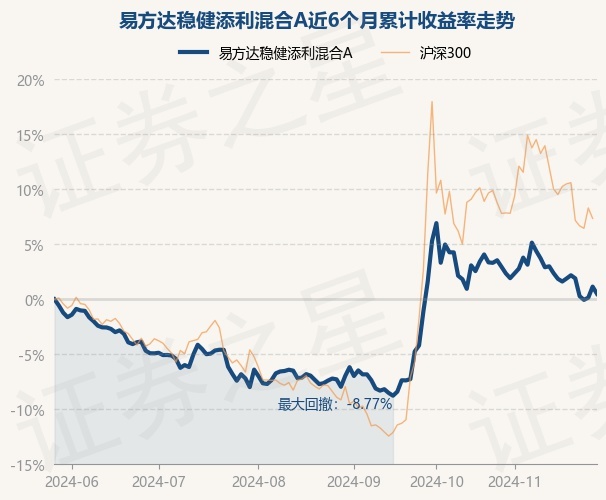 证券之星消息,11月28日,易方达稳健添利混合A最新单位净值为0.9526元,累计净值为0.9526元,较前一交易日下跌0.65%。历史数据显示该基金近1个月下跌2.94%,近3个月上涨9.18%,近6个月上涨0.5%,近1年上涨4.52%。该基金近6个月的累计收益率走势如下图: