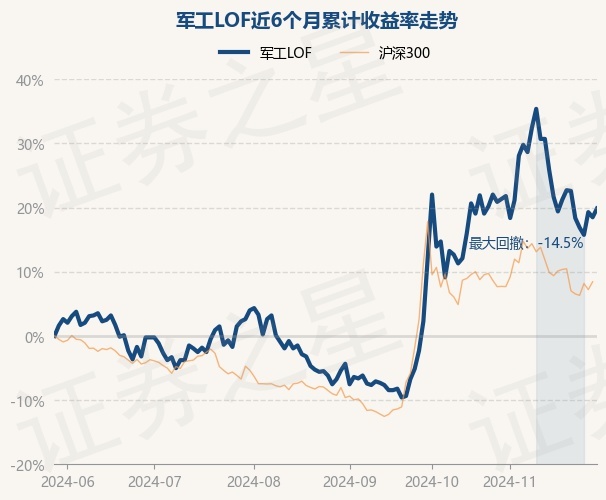 证券之星消息,11月29日,军工LOF最新单位净值为1.05元,累计净值为1.734元,较前一交易日上涨1.16%。历史数据显示该基金近1个月下跌0.85%,近3个月上涨26.66%,近6个月上涨19.86%,近1年上涨7.91%。该基金近6个月的累计收益率走势如下图: