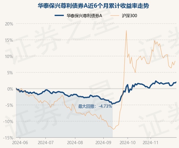 证券之星消息,11月29日,华泰保兴尊利债券A最新单位净值为1.2459元,累计净值为1.4092元,较前一交易日上涨0.26%。历史数据显示该基金近1个月上涨1.36%,近3个月上涨5.36%,近6个月上涨2.01%,近1年上涨11.91%。该基金近6个月的累计收益率走势如下图: