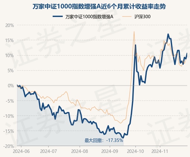 证券之星消息,11月29日,万家中证1000指数增强A最新单位净值为1.1356元,累计净值为1.8074元,较前一交易日上涨1.63%。历史数据显示该基金近1个月上涨2.88%,近3个月上涨29.52%,近6个月上涨10.53%,近1年下跌1.64%。该基金近6个月的累计收益率走势如下图: