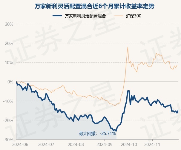 证券之星消息,11月29日,万家新利灵活配置混合最新单位净值为1.9414元,累计净值为2.304元,较前一交易日上涨1.64%。历史数据显示该基金近1个月下跌4.86%,近3个月上涨6.95%,近6个月下跌14.96%,近1年上涨6.69%。该基金近6个月的累计收益率走势如下图: