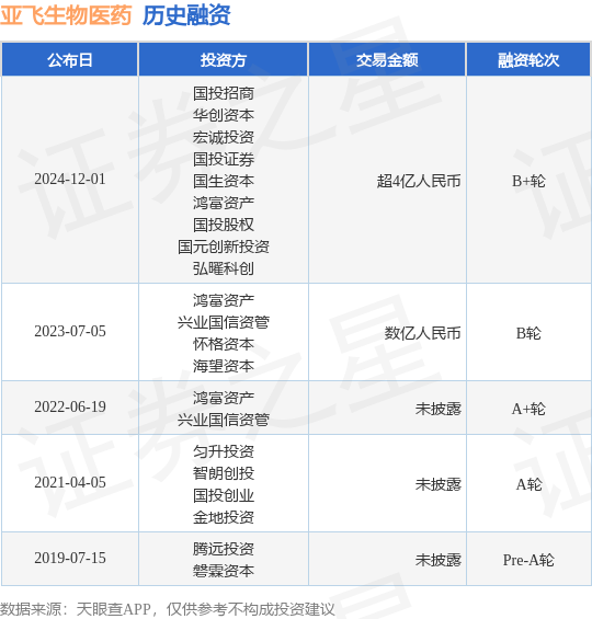 证券之星消息,根据天眼查APP于12月1日公布的信息整理,亚飞(上海)生物医药科技有限公司B+轮融资,融资额超4亿人民币,参与投资的机构包括国投招商,华创资本,宏诚投资,国投证券,国生资本,鸿富资产,国投股权,国元创新投资,弘曜科创。
