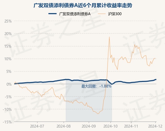 证券之星消息,12月3日,广发双债添利债券A最新单位净值为1.2269元,累计净值为1.6498元,较前一交易日上涨0.05%。历史数据显示该基金近1个月上涨1.22%,近3个月上涨0.52%,近6个月上涨1.72%,近1年上涨5.9%。该基金近6个月的累计收益率走势如下图: