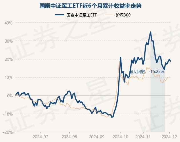 证券之星消息,12月3日,国泰中证军工ETF最新单位净值为1.0685元,累计净值为1.0685元,较前一交易日下跌0.94%。历史数据显示该基金近1个月上涨1.39%,近3个月上涨29.91%,近6个月上涨18.7%,近1年上涨9.09%。该基金近6个月的累计收益率走势如下图: