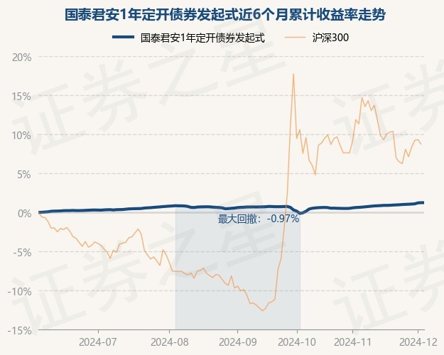 证券之星消息,12月4日,国泰君安1年定开债券发起式最新单位净值为1.0302元,累计净值为1.1196元,较前一交易日上涨0.0%。历史数据显示该基金近1个月上涨0.65%,近3个月上涨0.62%,近6个月上涨1.29%,近1年上涨4.65%。该基金近6个月的累计收益率走势如下图: