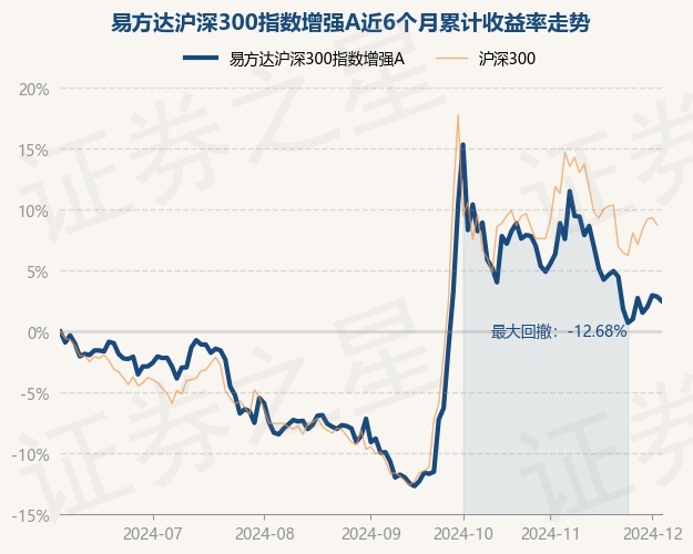 证券之星消息,12月4日,易方达沪深300指数增强A最新单位净值为0.7675元,累计净值为0.7675元,较前一交易日下跌0.36%。历史数据显示该基金近1个月下跌3.63%,近3个月上涨13.8%,近6个月上涨2.5%,近1年上涨18.75%。该基金近6个月的累计收益率走势如下图: