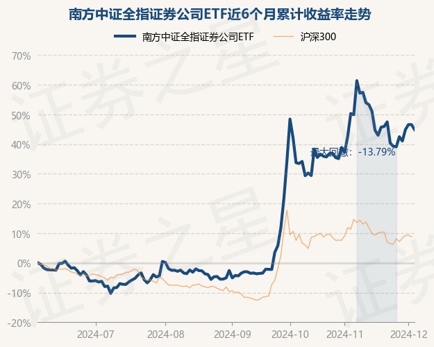 证券之星消息,12月4日,南方中证全指证券公司ETF最新单位净值为1.2011元,累计净值为1.2011元,较前一交易日下跌1.14%。历史数据显示该基金近1个月上涨1.61%,近3个月上涨51.54%,近6个月上涨44.89%,近1年上涨28.39%。该基金近6个月的累计收益率走势如下图: