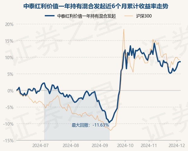 证券之星消息,12月5日,中泰红利价值一年持有混合发起最新单位净值为1.2802元,累计净值为1.2802元,较前一交易日上涨0.0%。历史数据显示该基金近1个月下跌3.4%,近3个月上涨15.3%,近6个月上涨8.33%,近1年上涨31.26%。该基金近6个月的累计收益率走势如下图: