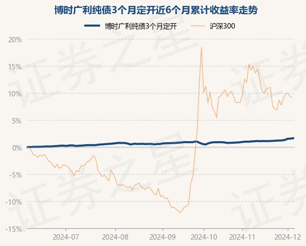 证券之星消息,12月5日,博时广利纯债3个月定开最新单位净值为1.0261元,累计净值为1.313元,较前一交易日上涨0.02%。历史数据显示该基金近1个月上涨0.63%,近3个月上涨0.9%,近6个月上涨1.67%,近1年上涨4.52%。该基金近6个月的累计收益率走势如下图: