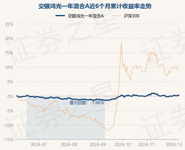 证券之星消息,12月6日,交银鸿光一年混合A最新单位净值为1.0292元,累计净值为1.0292元,较前一交易日上涨0.26%。历史数据显示该基金近1个月上涨0.02%,近3个月上涨1.77%,近6个月上涨0.36%,近1年上涨5.16%。该基金近6个月的累计收益率走势如下图: