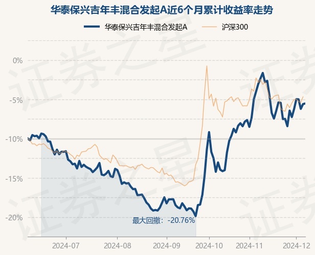 证券之星消息,12月6日,华泰保兴吉年丰混合发起A最新单位净值为1.8736元,累计净值为1.9686元,较前一交易日上涨0.13%。历史数据显示该基金近1个月下跌2.7%,近3个月上涨31.17%,近6个月上涨8.94%,近1年下跌3.61%。该基金近6个月的累计收益率走势如下图: