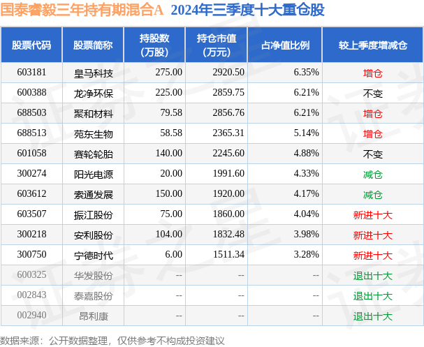 国泰睿毅三年持有期混合A为混合型-偏股基金,根据最新一期基金季报显示,该基金资产配置:股票占净值比91.06%,无债券类资产,现金占净值比9.07%。基金十大重仓股如下: