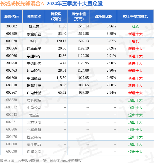 长城成长先锋混合A为混合型-偏股基金,根据最新一期基金季报显示,该基金资产配置:股票占净值比75.82%,无债券类资产,现金占净值比24.06%。基金十大重仓股如下:
