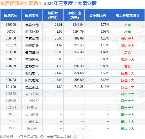 长信优质企业混合A为混合型-偏股基金,根据最新一期基金季报显示,该基金资产配置:股票占净值比85.0%,无债券类资产,现金占净值比14.17%。基金十大重仓股如下: