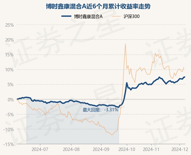 证券之星消息,12月6日,博时鑫康混合A最新单位净值为1.09元,累计净值为1.1284元,较前一交易日上涨0.11%。历史数据显示该基金近1个月上涨1.17%,近3个月上涨9.82%,近6个月上涨7.45%,近1年上涨3.72%。该基金近6个月的累计收益率走势如下图: