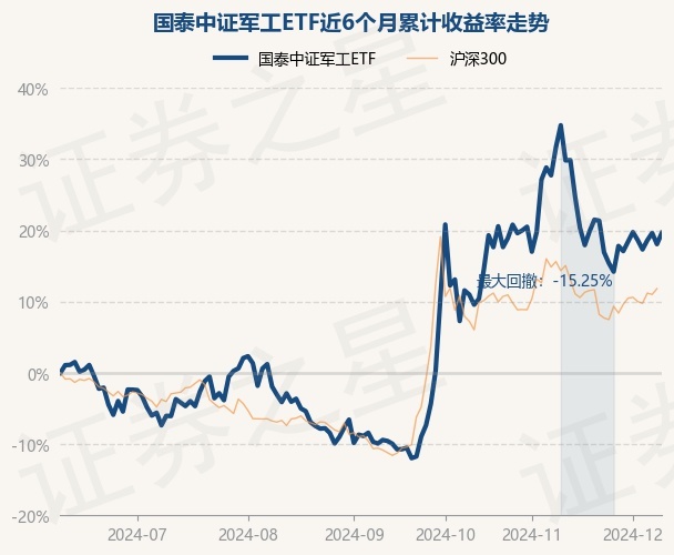 证券之星消息,12月10日,国泰中证军工ETF最新单位净值为1.0775元,累计净值为1.0775元,较前一交易日上涨1.33%。历史数据显示该基金近1个月下跌9.14%,近3个月上涨32.08%,近6个月上涨19.64%,近1年上涨14.03%。该基金近6个月的累计收益率走势如下图: