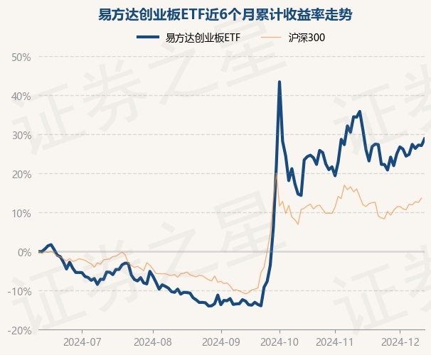 证券之星消息,12月12日,易方达创业板ETF最新单位净值为2.2485元,累计净值为2.5759元,较前一交易日上涨1.36%。历史数据显示该基金近1个月下跌4.13%,近3个月上涨47.6%,近6个月上涨28.86%,近1年上涨21.21%。该基金近6个月的累计收益率走势如下图: