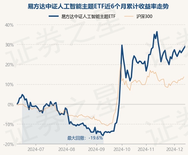 证券之星消息,12月12日,易方达中证人工智能主题ETF最新单位净值为0.9344元,累计净值为0.9344元,较前一交易日上涨0.8%。历史数据显示该基金近1个月下跌2.92%,近3个月上涨50.47%,近6个月上涨29.08%,近1年上涨18.4%。该基金近6个月的累计收益率走势如下图: