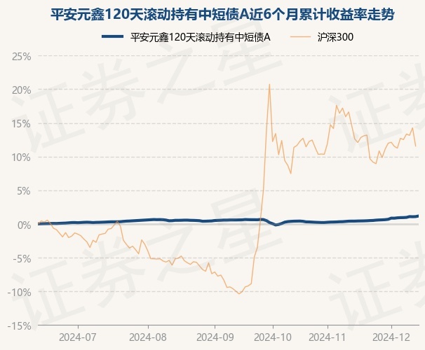 证券之星消息,12月13日,平安元鑫120天滚动持有中短债A最新单位净值为1.1151元,累计净值为1.1151元,较前一交易日上涨0.09%。历史数据显示该基金近1个月上涨0.76%,近3个月上涨0.57%,近6个月上涨1.18%,近1年上涨3.76%。该基金近6个月的累计收益率走势如下图: