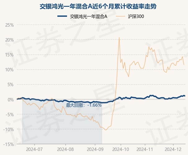 证券之星消息,12月13日,交银鸿光一年混合A最新单位净值为1.0334元,累计净值为1.0334元,较前一交易日下跌0.14%。历史数据显示该基金近1个月上涨0.14%,近3个月上涨2.23%,近6个月上涨1.08%,近1年上涨5.44%。该基金近6个月的累计收益率走势如下图:
