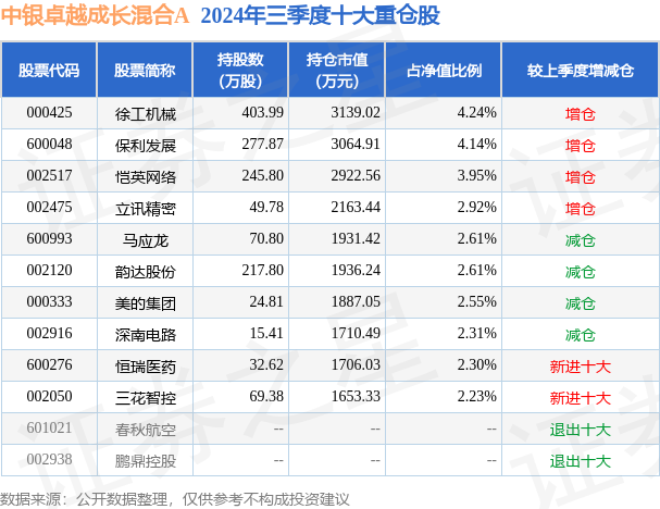 中银卓越成长混合A为混合型-偏股基金,根据最新一期基金季报显示,该基金资产配置:股票占净值比92.35%,债券占净值比4.12%,现金占净值比3.65%。基金十大重仓股如下: