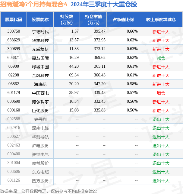 招商瑞鸿6个月持有混合A为混合型-偏债基金,根据最新一期基金季报显示,该基金资产配置:股票占净值比20.57%,债券占净值比72.88%,现金占净值比1.66%。基金十大重仓股如下: