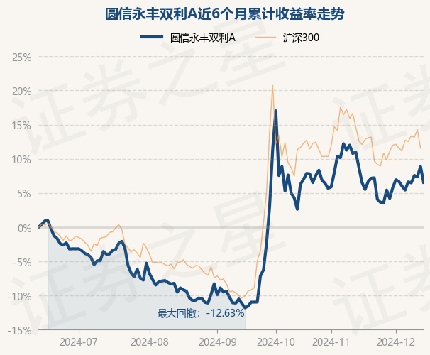 证券之星消息,12月13日,圆信永丰双利A最新单位净值为0.805元,累计净值为2.581元,较前一交易日下跌2.14%。历史数据显示该基金近1个月下跌3.98%,近3个月上涨20.82%,近6个月上涨6.55%,近1年上涨10.18%。该基金近6个月的累计收益率走势如下图: