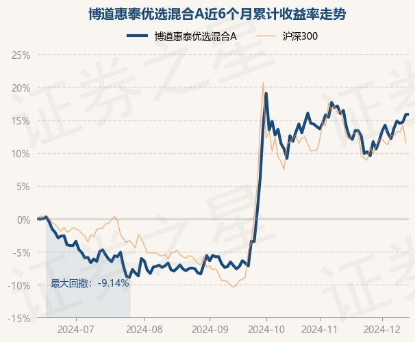 证券之星消息,12月13日,博道惠泰优选混合A最新单位净值为1.0591元,累计净值为1.0591元,较前一交易日上涨0.0%。历史数据显示该基金近1个月下跌1.94%,近3个月上涨23.63%,近6个月上涨14.21%,近1年上涨20.28%。该基金近6个月的累计收益率走势如下图: