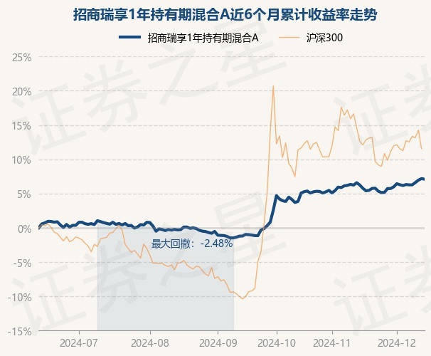 证券之星消息,12月13日,招商瑞享1年持有期混合A最新单位净值为1.0739元,累计净值为1.0948元,较前一交易日下跌0.08%。历史数据显示该基金近1个月上涨0.48%,近3个月上涨8.14%,近6个月上涨7.09%,近1年上涨8.67%。该基金近6个月的累计收益率走势如下图: