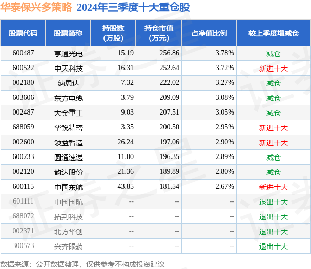 华泰保兴多策略为股票型基金,根据最新一期基金季报显示,该基金资产配置:股票占净值比89.4%,无债券类资产,现金占净值比9.59%。基金十大重仓股如下: