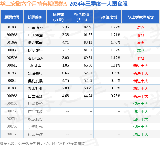 华宝安融六个月持有期债券A为债券型-混合二级基金,根据最新一期基金季报显示,该基金资产配置:股票占净值比15.74%,债券占净值比82.03%,现金占净值比15.9%。基金十大重仓股如下: