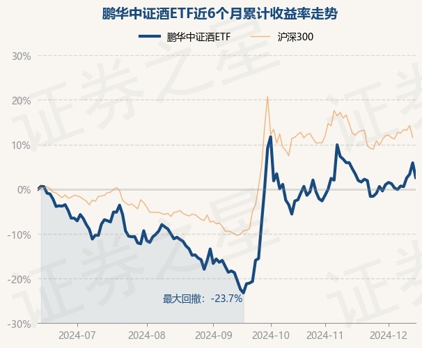 证券之星消息,12月13日,鹏华中证酒ETF最新单位净值为0.6472元,累计净值为1.9944元,较前一交易日下跌3.11%。历史数据显示该基金近1个月下跌3.14%,近3个月上涨32.24%,近6个月上涨2.6%,近1年下跌4.02%。该基金近6个月的累计收益率走势如下图: