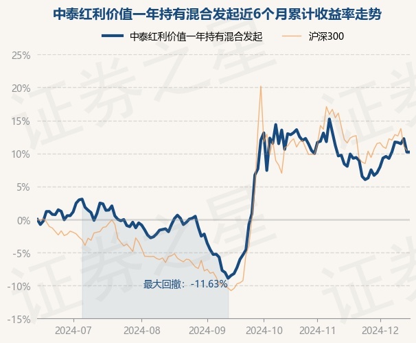 证券之星消息,12月16日,中泰红利价值一年持有混合发起最新单位净值为1.2892元,累计净值为1.2892元,较前一交易日上涨0.0%。历史数据显示该基金近1个月上涨1.82%,近3个月上涨19.84%,近6个月上涨10.01%,近1年上涨32.35%。该基金近6个月的累计收益率走势如下图: