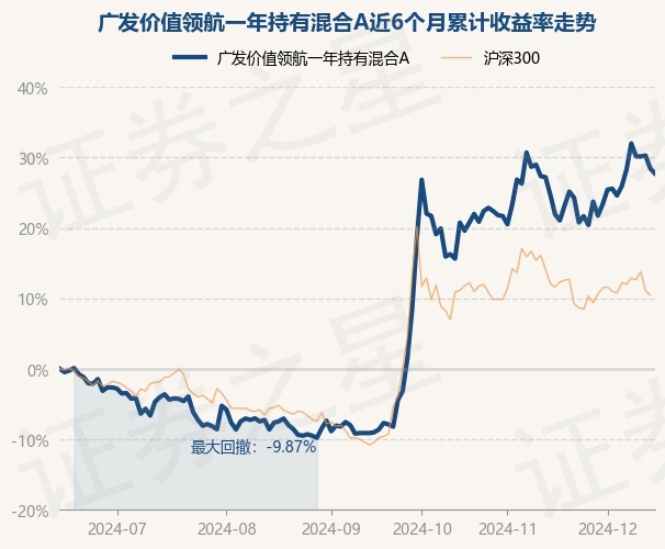 证券之星消息,12月16日,广发价值领航一年持有混合A最新单位净值为1.2753元,累计净值为1.2753元,较前一交易日下跌0.55%。历史数据显示该基金近1个月上涨4.75%,近3个月上涨40.36%,近6个月上涨27.72%,近1年上涨31.79%。该基金近6个月的累计收益率走势如下图: