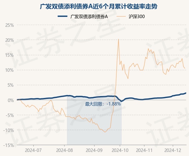 证券之星消息,12月16日,广发双债添利债券A最新单位净值为1.2377元,累计净值为1.6606元,较前一交易日上涨0.16%。历史数据显示该基金近1个月上涨1.66%,近3个月上涨1.14%,近6个月上涨2.27%,近1年上涨6.63%。该基金近6个月的累计收益率走势如下图: