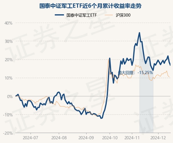 证券之星消息,12月16日,国泰中证军工ETF最新单位净值为1.0542元,累计净值为1.0542元,较前一交易日下跌1.36%。历史数据显示该基金近1个月下跌2.76%,近3个月上涨31.14%,近6个月上涨16.86%,近1年上涨11.06%。该基金近6个月的累计收益率走势如下图: