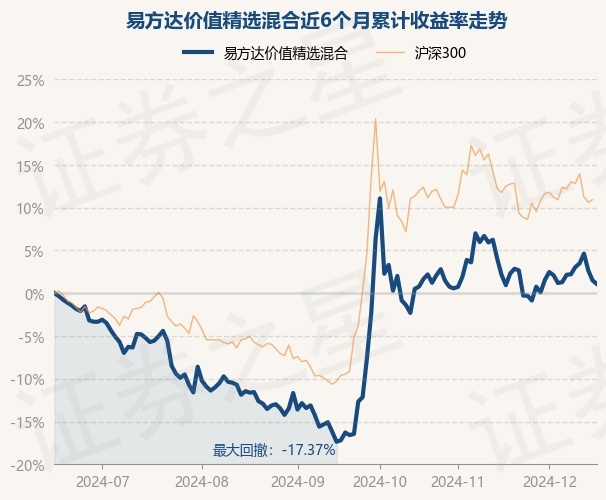 证券之星消息,12月17日,易方达价值精选混合最新单位净值为1.1329元,累计净值为3.8419元,较前一交易日下跌0.41%。历史数据显示该基金近1个月下跌1.07%,近3个月上涨22.3%,近6个月上涨1.06%,近1年上涨8.04%。该基金近6个月的累计收益率走势如下图: