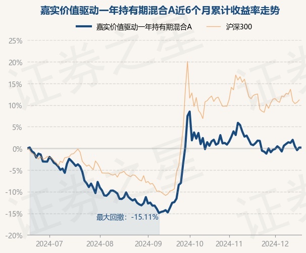 证券之星消息,12月18日,嘉实价值驱动一年持有期混合A最新单位净值为0.9363元,累计净值为0.9363元,较前一交易日下跌0.01%。历史数据显示该基金近1个月下跌0.56%,近3个月上涨16.11%,近6个月上涨0.17%,近1年上涨16.4%。该基金近6个月的累计收益率走势如下图: