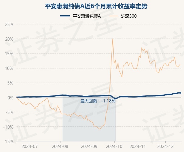 证券之星消息,12月18日,平安惠澜纯债A最新单位净值为1.1224元,累计净值为1.2074元,较前一交易日下跌0.04%。历史数据显示该基金近1个月上涨0.99%,近3个月上涨0.85%,近6个月上涨1.45%,近1年上涨4.61%。该基金近6个月的累计收益率走势如下图: