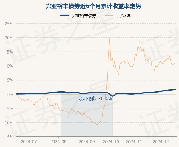 证券之星消息,12月18日,兴业裕丰债券最新单位净值为1.0806元,累计净值为1.3156元,较前一交易日下跌0.04%。历史数据显示该基金近1个月上涨1.1%,近3个月上涨1.08%,近6个月上涨1.58%,近1年上涨4.91%。该基金近6个月的累计收益率走势如下图:
