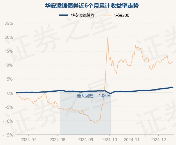 证券之星消息,12月18日,华安添锦债券最新单位净值为1.0526元,累计净值为1.0706元,较前一交易日下跌0.1%。历史数据显示该基金近1个月上涨1.02%,近3个月上涨1.15%,近6个月上涨1.85%,近1年上涨4.67%。该基金近6个月的累计收益率走势如下图: