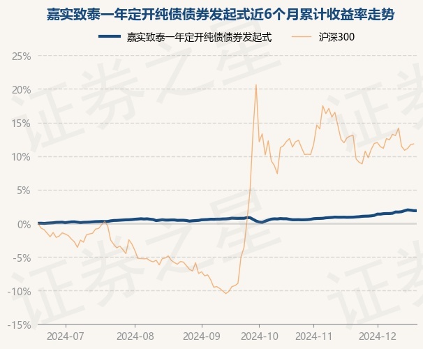 证券之星消息,12月19日,嘉实致泰一年定开纯债债券发起式最新单位净值为1.0399元,累计净值为1.0795元,较前一交易日下跌0.01%。历史数据显示该基金近1个月上涨0.96%,近3个月上涨1.12%,近6个月上涨1.87%,近1年上涨4.8%。该基金近6个月的累计收益率走势如下图: