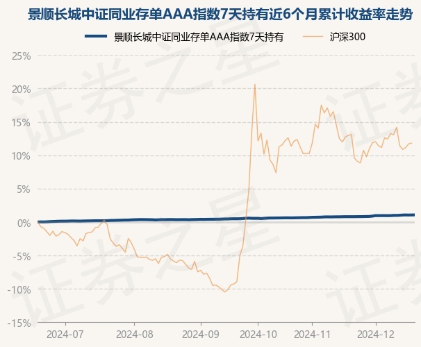 证券之星消息,12月19日,景顺长城中证同业存单AAA指数7天持有最新单位净值为1.062元,累计净值为1.062元,较前一交易日上涨0.01%。历史数据显示该基金近1个月上涨0.26%,近3个月上涨0.58%,近6个月上涨1.07%,近1年上涨2.46%。该基金近6个月的累计收益率走势如下图: